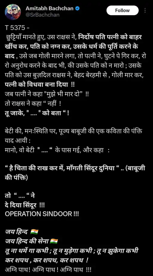 ପହଲଗାମ ଆକ୍ରମଣ ସମଗ୍ର ଦେଶକୁ ଥରାଇ ଦେଇଥିଲା । ଯାହା ପରେ ଭାରତ ପାକିସ୍ତାନ ବିରୋଧରେ କଠୋର କାର୍ୟ୍ୟାନୁଷ୍ଠାନ ଗ୍ରହଣ କରିଥିଲା । ଆକ୍ରମଣରେ ପାକିସ୍ତାନ ୯ ଆତଙ୍କୀ ଶିବିରକୁ ଧ୍ବଂସ କରିବାରେ ସଫଳ ହୋଇଥିଲା ଭାରତ । ଯାହାକୁ ନେଇ ସାଧାରଣ ଲୋକଙ୍କଠାରୁ ଆରମ୍ଭ କରି ବଡ ବଡ ନେତା, ଅଭିନେତା ପର୍ୟ୍ୟନ୍ତ ସମସ୍ତେ ନିଜେ ନିଜର ପ୍ରତିକ୍ରିୟା ଦେଇଥିଲେ ।ଏହାରି ମଧ୍ୟରେ ଦଶନ୍ଧି ଧରି ଲୋକଙ୍କ ହୃଦୟରେ ରାଜ କରି ଆସୁଥିବା ଅମିତାଭ ବଚ୍ଚନ ଏହି ବାବଦରେ କୌଣସି ପ୍ରତିକ୍ରିୟା ରଖିନଥିଲେ । ତାଙ୍କର ଏପରି କାର୍ୟ୍ୟକଳାପ ଦେଖି ପ୍ରଶଂସକମାନଙ୍କୁ ତାଙ୍କୁ ପସନ୍ଦ କରିନଥିଲେ । କିନ୍ତୁ ବିଗ ବି ଅନେକ ଦିନ ଧରି ଟ୍ୱିଟ କରୁଥିଲେ । ଏ ଘଟଣାର ପ୍ରତିକ୍ରିୟା ପାଇଁ ଅମିତାଭଙ୍କ ଟ୍ୱିଟଗୁଡିକୁ ଫ୍ୟାନ୍ସ ନଜର ରଖୁଥିଲେ । ହେଲେ ସେହି ସମ୍ବନ୍ଧୀୟ କୌଣସି ପ୍ରତିକ୍ରିୟା ପାଇପାରୁନଥିଲେ । ଅମିତାଭଙ୍କର ଏକ ପୋଷ୍ଟ ଏବେ ଭାଇରଲ ହେବାରେ ଲାଗିଛି ।