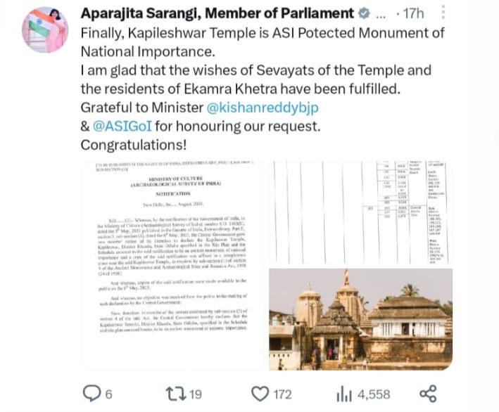 କଟକ : ରାଷ୍ଟ୍ରୀୟ ମହତ୍ୱ ସ୍ମାରକୀ ମାନ୍ୟତା ପାଇଲା ଭୁବନେଶ୍ୱରର କପିଳେଶ୍ୱର ମନ୍ଦିର । କେନ୍ଦ୍ର ସରକାରଙ୍କ ପକ୍ଷରୁ ପ୍ରକାଶିତ ଘୋଷଣା ପତ୍ରକୁ ଟ୍ୱିଟ କରି ସୂଚନା ଦେଲେ ସାଂସଦ ଅପରାଜିତା ଷଡ଼ଙ୍ଗୀ । ମନ୍ଦିର ସେବାୟତ ଓ ଏକାମ୍ର କ୍ଷେତ୍ରର ବାସିନ୍ଦାଙ୍କ ଇଛା ପୂରଣ ହୋଇଛି ବୋଲି କହିବା ସହ କେନ୍ଦ୍ର ସଂସ୍କୃତି ଓ ପର୍ୟ୍ୟଟନ ମନ୍ତ୍ରୀ ଜି. କିଷାନ ରେଡ୍ଡୀଙ୍କୁ ଜଣାଇଲେ କୃତଜ୍ଞତା ଜଣାଇଛନ୍ତି ସାଂସଦ । ଅନ୍ୟପଟେ ମନ୍ଦିର ସେବାୟତ ଓ ଗ୍ରାମବାସୀ ଖୁସି ବ୍ୟକ୍ତ କରିବା ସହ ସାଂସଦଙ୍କୁ କୃତଜ୍ଞତା ଜଣାଇଛନ୍ତି । ପଂଚଦଶ ଶତାବ୍ଦୀରେ କପିଳେଶ୍ୱର ମନ୍ଦିର ନିର୍ମାଣ ହୋଇଥିଲା । ହେଲେ ରକ୍ଷଣାବେକ୍ଷଣ ଅଭାବରୁ ମନ୍ଦିରରେ ନାନା ସମସ୍ୟା ଦେଖାଦେଇଥିଲା । ମନ୍ଦିର ସୁରକ୍ଷା ନେଇ ସେବାୟତମାନେ ବାରମ୍ବାର ଦାବି କରି ଆସୁଥିଲେ ।ଏନେଇ ସାଂସଦ କପିଳେଶ୍ୱର ମନ୍ଦିର ଦାୟିତ୍ୱ ଏଏସଆଇ ଅଧିନକୁ ନେବାକୁ ଏପ୍ରିଲ ୩ରେ ଚିଠି ଲେଖିବା ସହ କେନ୍ଦ୍ର ସଂସ୍କୃତି ଓ ପର୍ୟ୍ୟଟନ ମନ୍ତ୍ରୀ ଜି କିଷାନ ରେଡ୍ଡୀଙ୍କୁ ଭେଟି ଦାବି କରିଥିଲେ ।