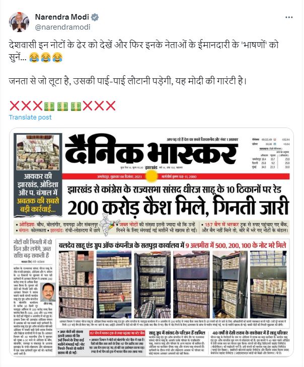 ନୂଆଦିଲ୍ଲୀ : ମଦ ବ୍ୟବସାୟୀଙ୍କ ଘରୁ ଶହ ଶହ କୋଟି ଟଙ୍କା ମିଳିବା ଘଟଣା । ଘଟଣାକୁ ନେଇ ଏକ୍ସରେ ପ୍ରତିକ୍ରିୟା ଦେଲେ ପ୍ରଧାନମନ୍ତ୍ରୀ ମୋଦି । ଦେଶବାସୀ ଟଙ୍କାର ପାହାଡ ଦେଖନ୍ତୁ ଓ ତାଙ୍କ ନେତାଙ୍କ ଭାଷଣ ଶୁଣନ୍ତୁ । ଟଙ୍କା ଦେଖନ୍ତୁ ଓ ସେମାନଙ୍କ ନେତାଙ୍କର ଇମାନଦାରୀର ଭାଷଣ ଶୁଣନ୍ତୁ । ଜନତାଙ୍କଠାରୁ ଯାହା ଲୁଟିଛ, ତାକୁ କଡାଗଣ୍ଡା ଫେରାଇବାକୁ ପଡିବ । ଏହା ମୋଦିଙ୍କର ଗ୍ୟାରେଣ୍ଟି ବୋଲି ଏକ୍ସରେ ଲେଖିଲେ ପ୍ରଧାନମନ୍ତ୍ରୀ ।