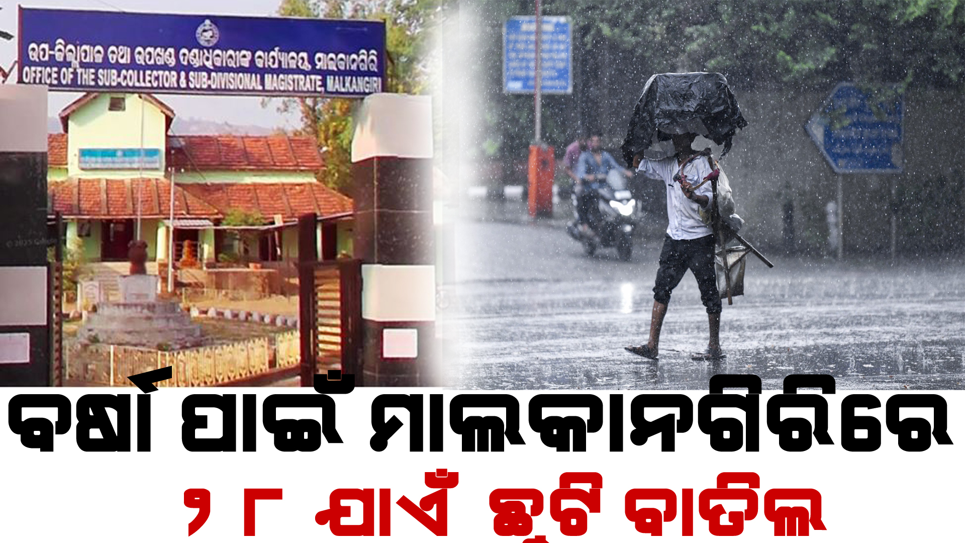 ମାଲକାନଗିରି :ମାଲକାନଗିରି ଜିଲ୍ଲାରେ ୨୮ ଯାଏଁ ସରକାରୀ କର୍ମଚାରୀଙ୍କ ଛୁଟି ବାତିଲ । ପ୍ରବଳ ବର୍ଷା ସମ୍ଭାବନାକୁ ଦୃଷ୍ଟିରେ ରଖି ଛୁଟି ବାତିଲ କଲେ ଜିଲ୍ଲାପାଳ । ହେଡ କ୍ୱାର୍ଟର୍ସ ନ ଛାଡିବା ପାଇଁ ସରକାରୀ କର୍ମଚାରୀଙ୍କୁ ନିଦେ୍ର୍ଦଶ । ଜିଲ୍ଲାପାଳଙ୍କ ଅନୁମତି ବିନା ମୁଖ୍ୟାଳୟ ନ ଛାଡିବା ପାଇଁ ନିଦେ୍ର୍ଦଶନାମା । ନିଦେ୍ର୍ଦଶନାମାକୁ ଅବମାନନା କଲେ ଦୃଢ କାର୍ଯ୍ୟାନୁଷ୍ଠାନ ନିଆଯିବ ।